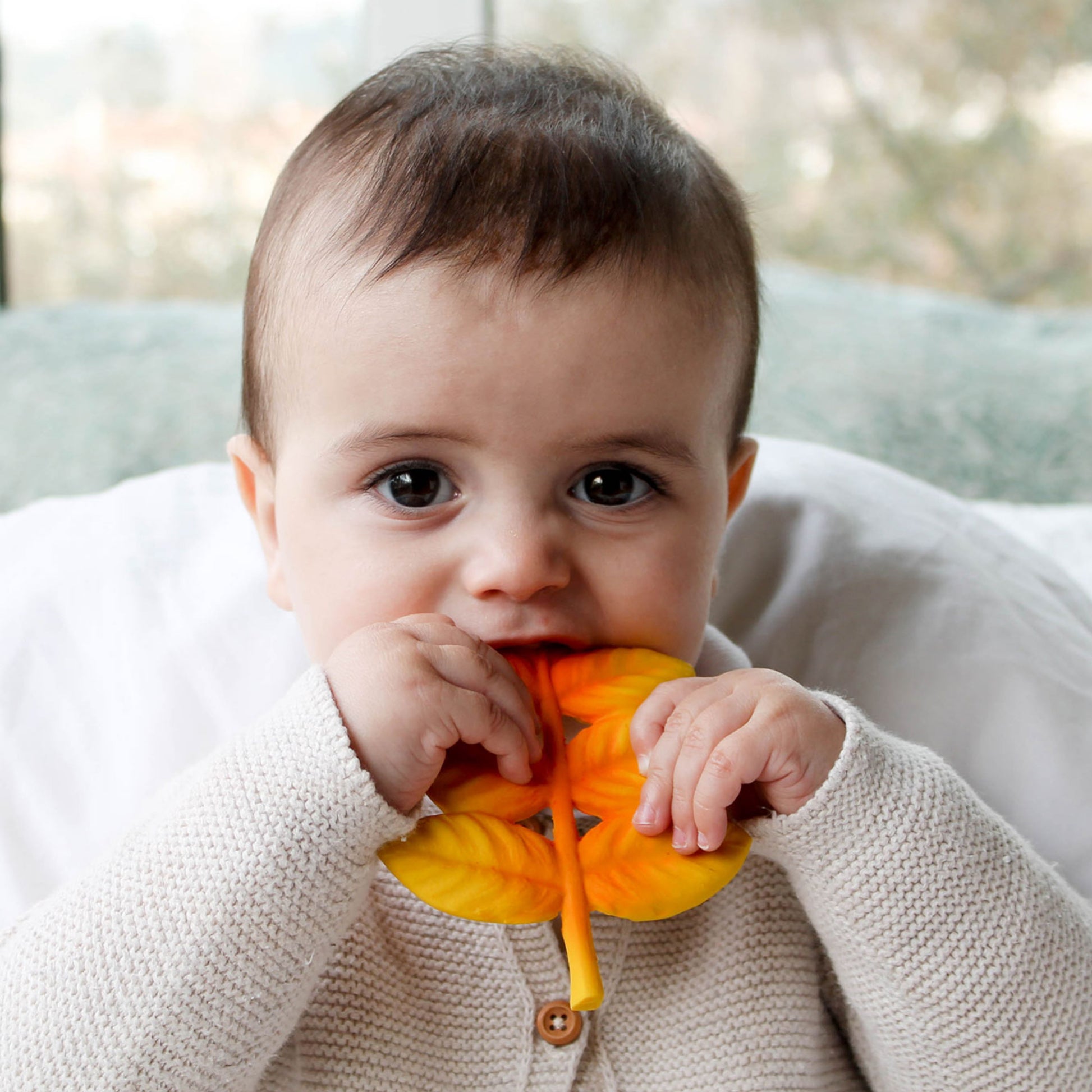 Ett vackert format löv i naturgummi, perfekt för små händer att greppa eller tänder att bita på vid tandsprickning. Relief och mellanrum ger en stimulerande kontrast för spädbarn. Tillverkad av klimatsmart naturgummi, är denna 11 cm stora bitring mjuk, slitstark och säker för vassa tänder. Fri från ftalater, nitrosaminer och allergiframkallande ämnen, erbjuder den ett miljövänligt alternativ till plast. Passar nyfödda och uppåt för trygg och engagerande lek.