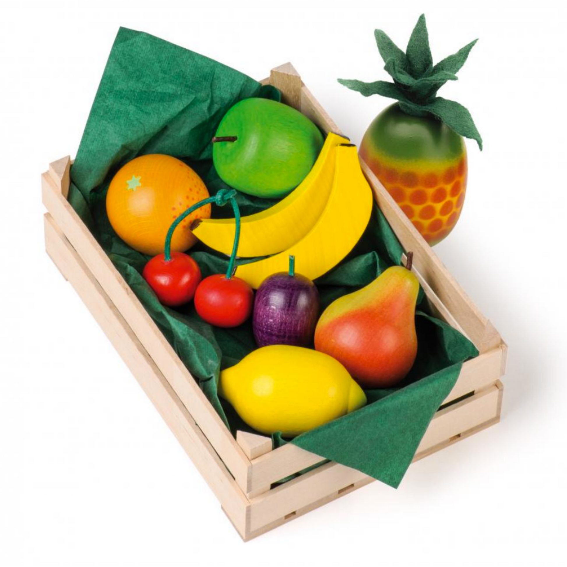 En fruktkorg i trä, 17 x 12 x 6 cm, med nio fina träfrukter i storlekar från 3 till 8 cm, innehållande två apelsiner, en citron, en halv kiwi, en ananas och fyra bananer. Tillverkad av ett tyskt familjeföretag med lokal produktion och lång tradition av naturmaterial, garanterar deras engagerade team högkvalitativa, miljövänliga leksaker. Perfekt för kreativ lek i låtsaskök eller butik, passar barn från 3 år och uppåt, men är inte lämpligt för barn under 36 månader på grund av smådelar.