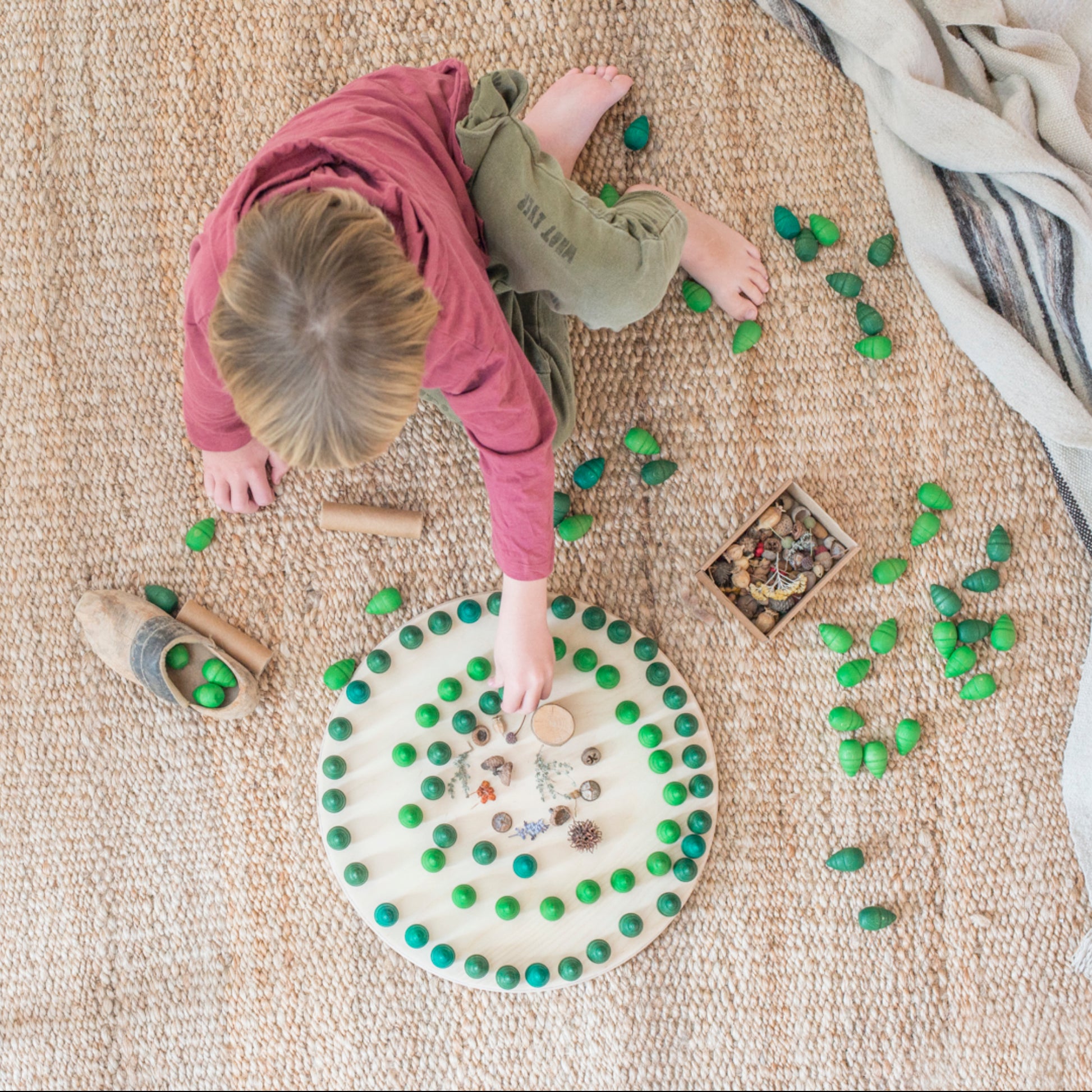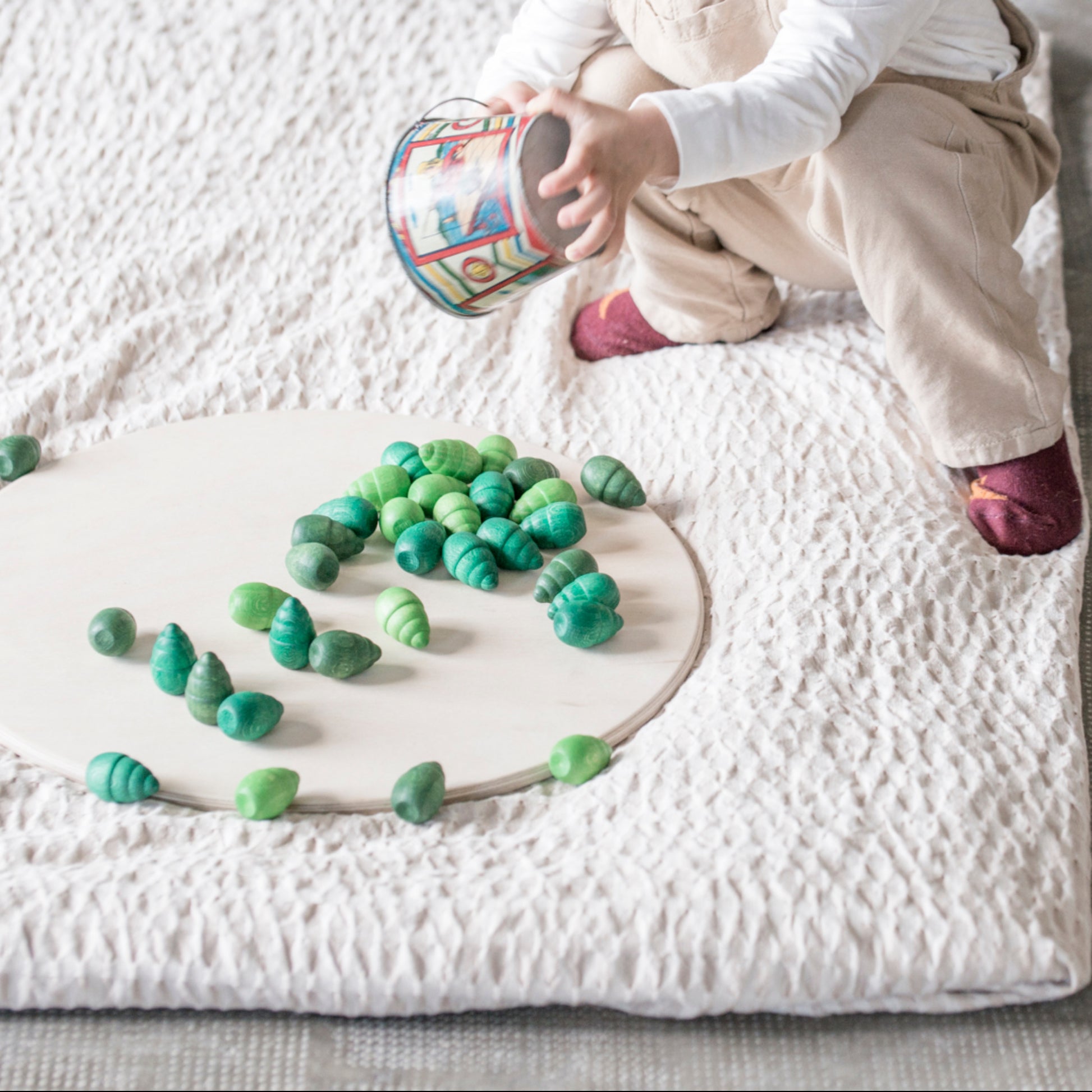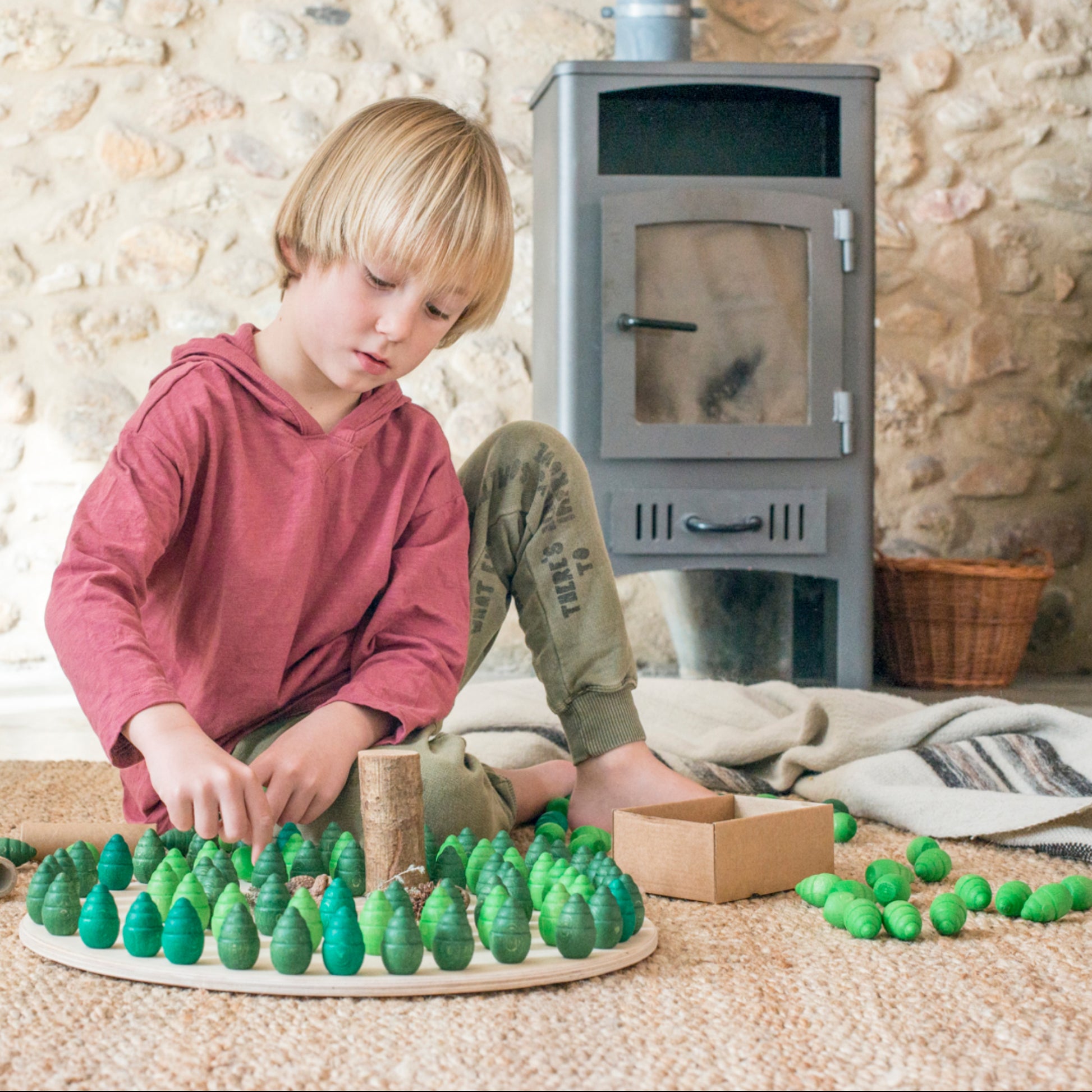Trettiosex handgjorda små träd, 3,8 cm höga, i olika gröna nyanser, perfekta för fri lek och skapande av fantasifulla landskap. Tillverkade av hållbart trä med vacker, naturlig ådring som känns levande och doftar gott, främjar dessa bitar logiskt-matematiskt tänkande genom klassificering, gruppering och association. Levereras med en praktisk förvaringspåse. Passar barn från 3 till 10 år, där leken anpassas efter åldern. Miljövänlig och skapad för glädjefyllda stunder.