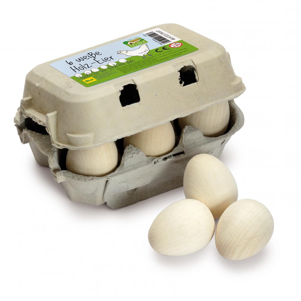 Sex träägg, knappt 5 cm höga, förpackade i en äggkartong, perfekta för kreativ lek i låtsaskök eller butik. Tillverkade av FSC-certifierat trä inom EU av ett litet företag med passion för handgjorda leksaker och omsorg om varje detalj. Passar barn från 3 år och uppåt för engagerande och miljövänliga lekstunder. Finns i tre varianter.