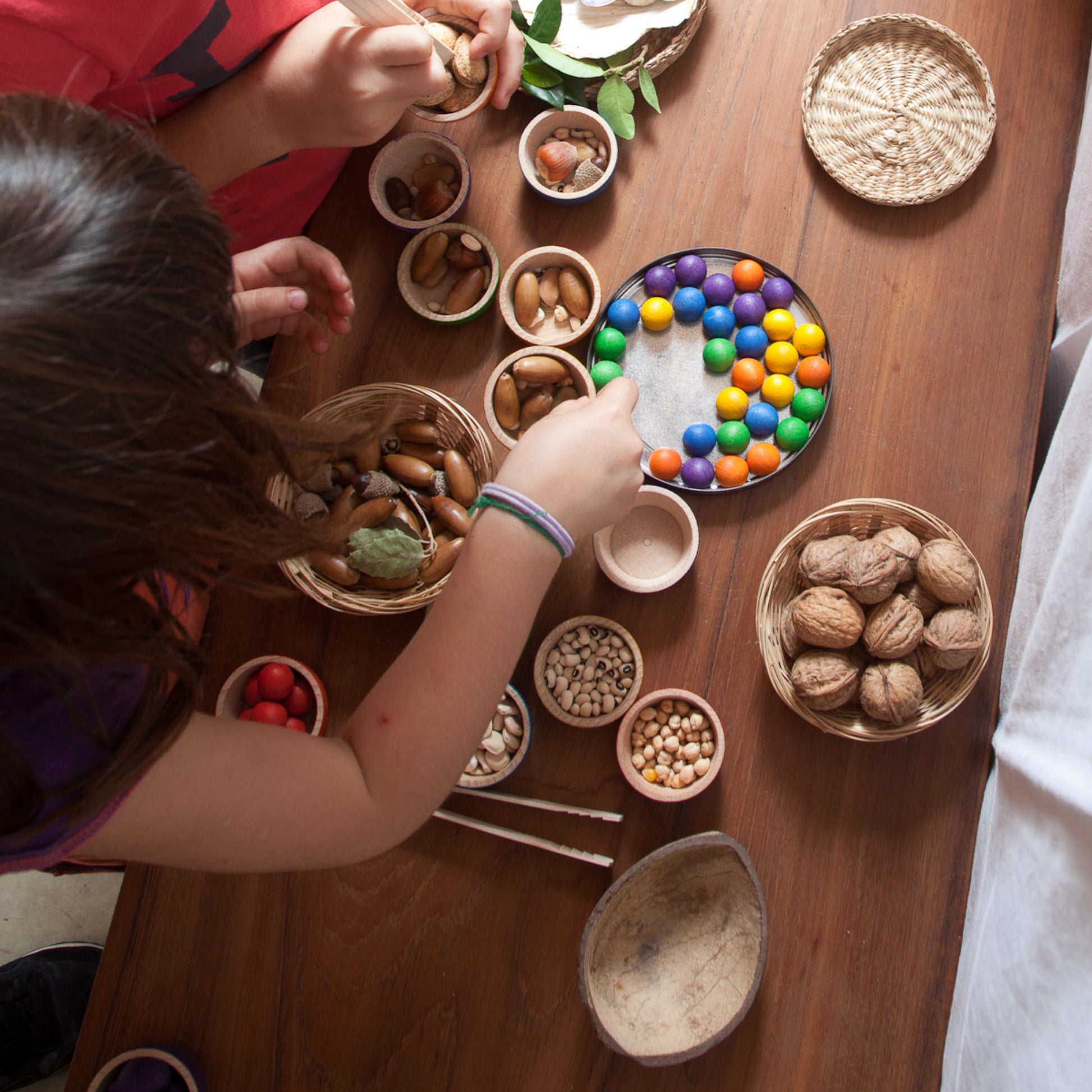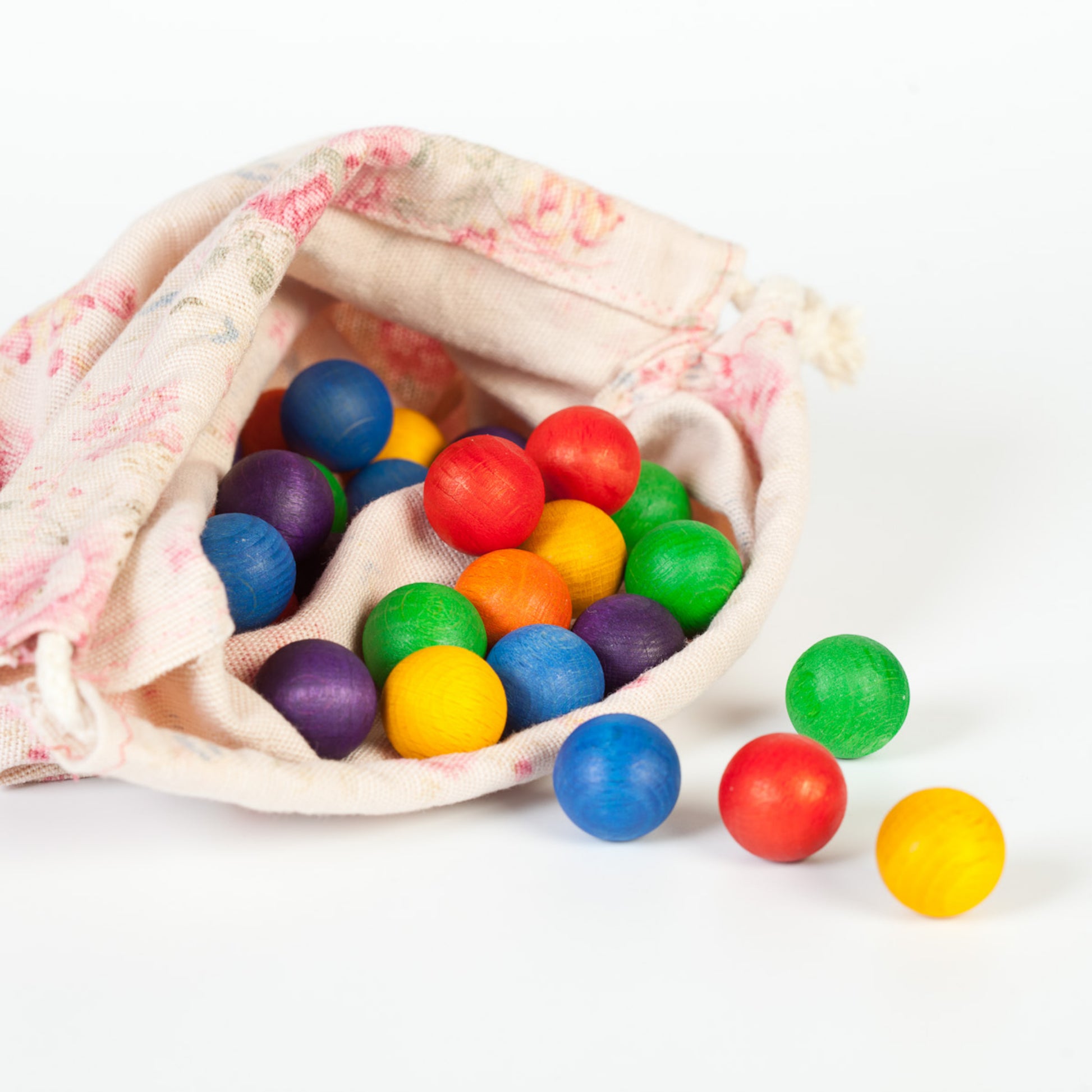 36 kulor i trä i regnbågens färger som levereras i en fin påse för bra förvaring. Varje kula är handgjord och unik. Träets vackra ådring och struktur finns kvar. Trä är ett levande material som kan vara både hårt och mjukt, lent och strävt, och som luktar gott.