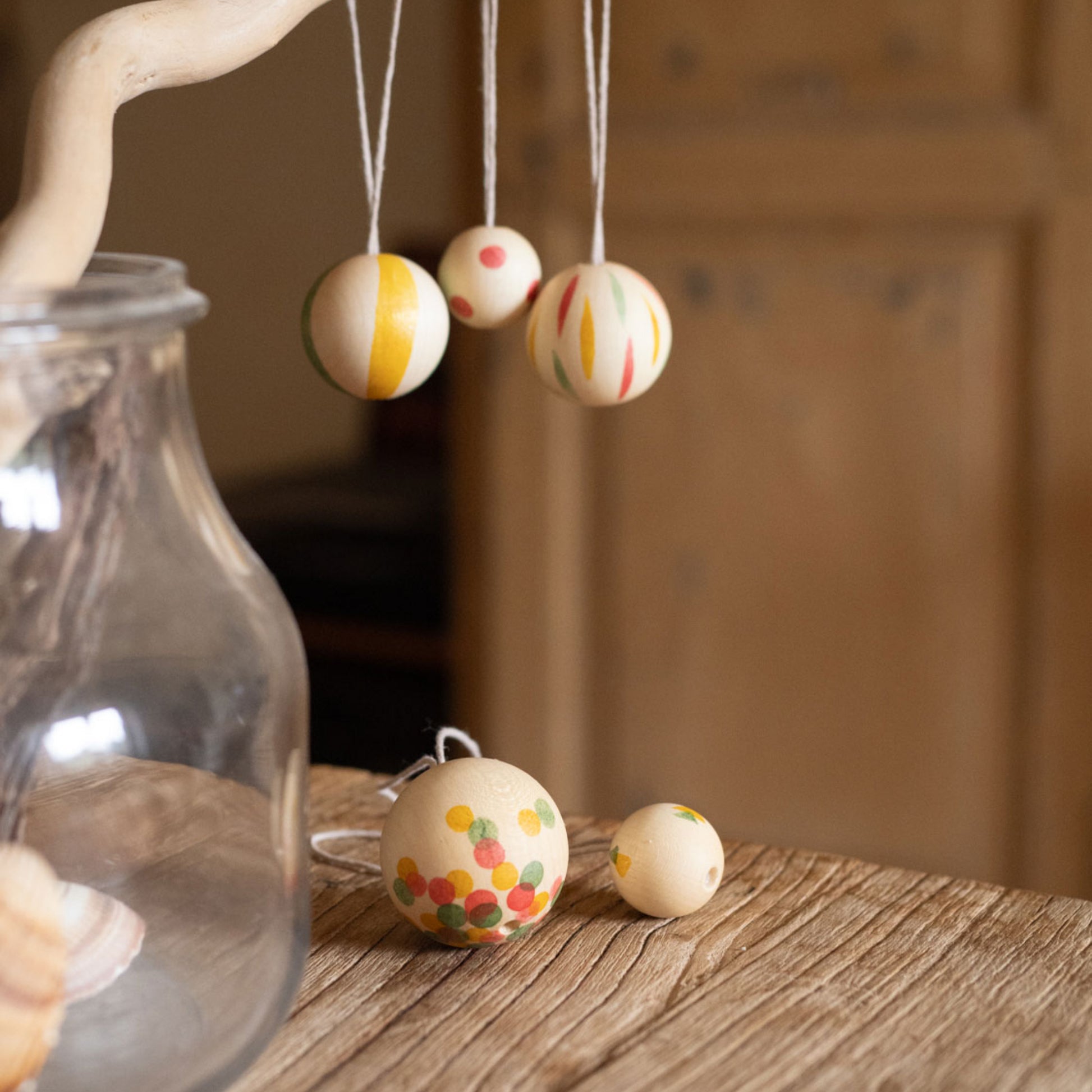 Fem handmålade kulor, 68 mm stora, i en liten ask, perfekta att hänga i julgranen eller använda i fantasifull lek. Tillverkade av PEFC-certifierat trä, behandlat med vegetabiliska vaxer eller oljor, för en hållbar och miljövänlig design. Passar barn från 3 till 10 år, där leken anpassas efter åldern, och erbjuder en charmig, högkvalitativ dekoration för glädjefyllda julstunder.