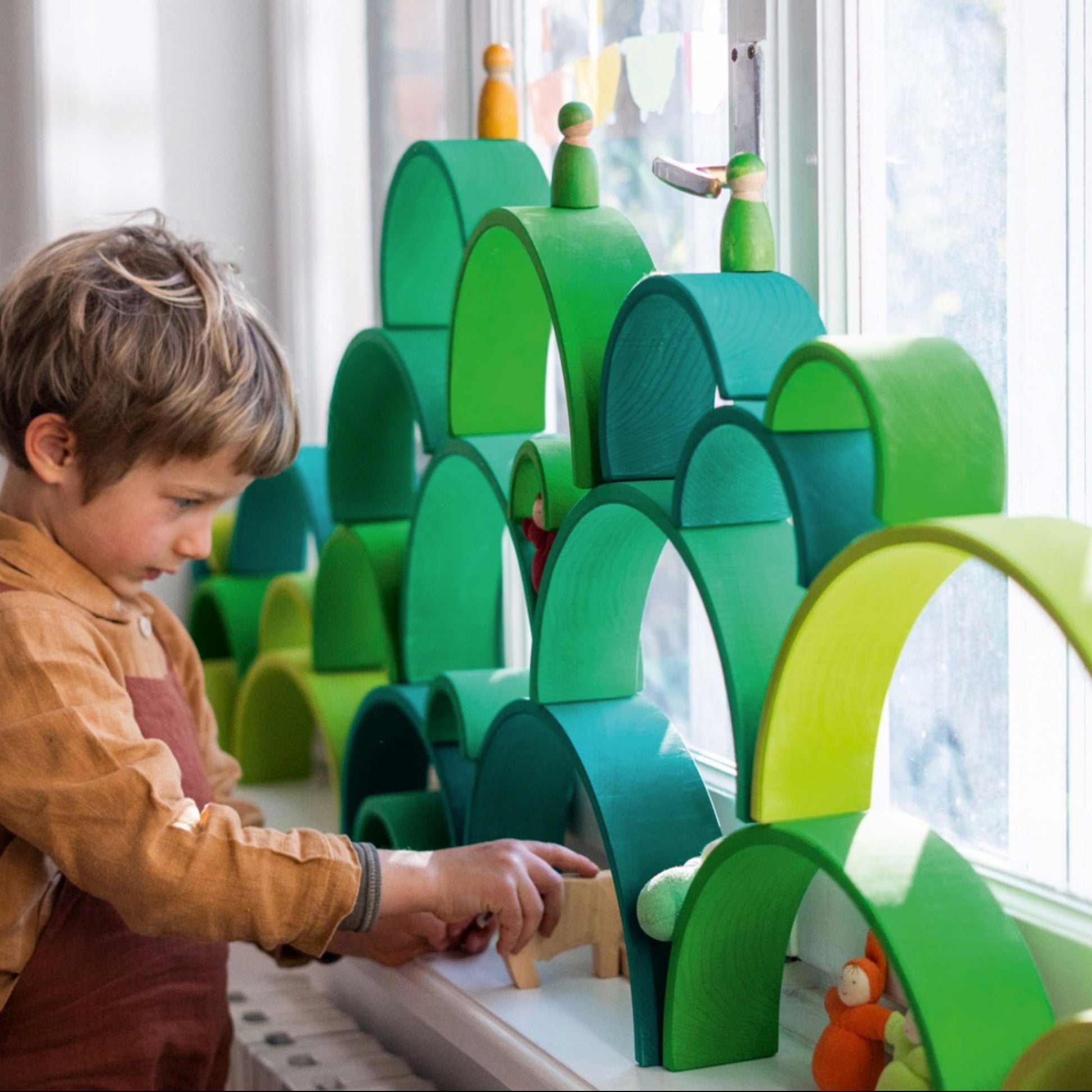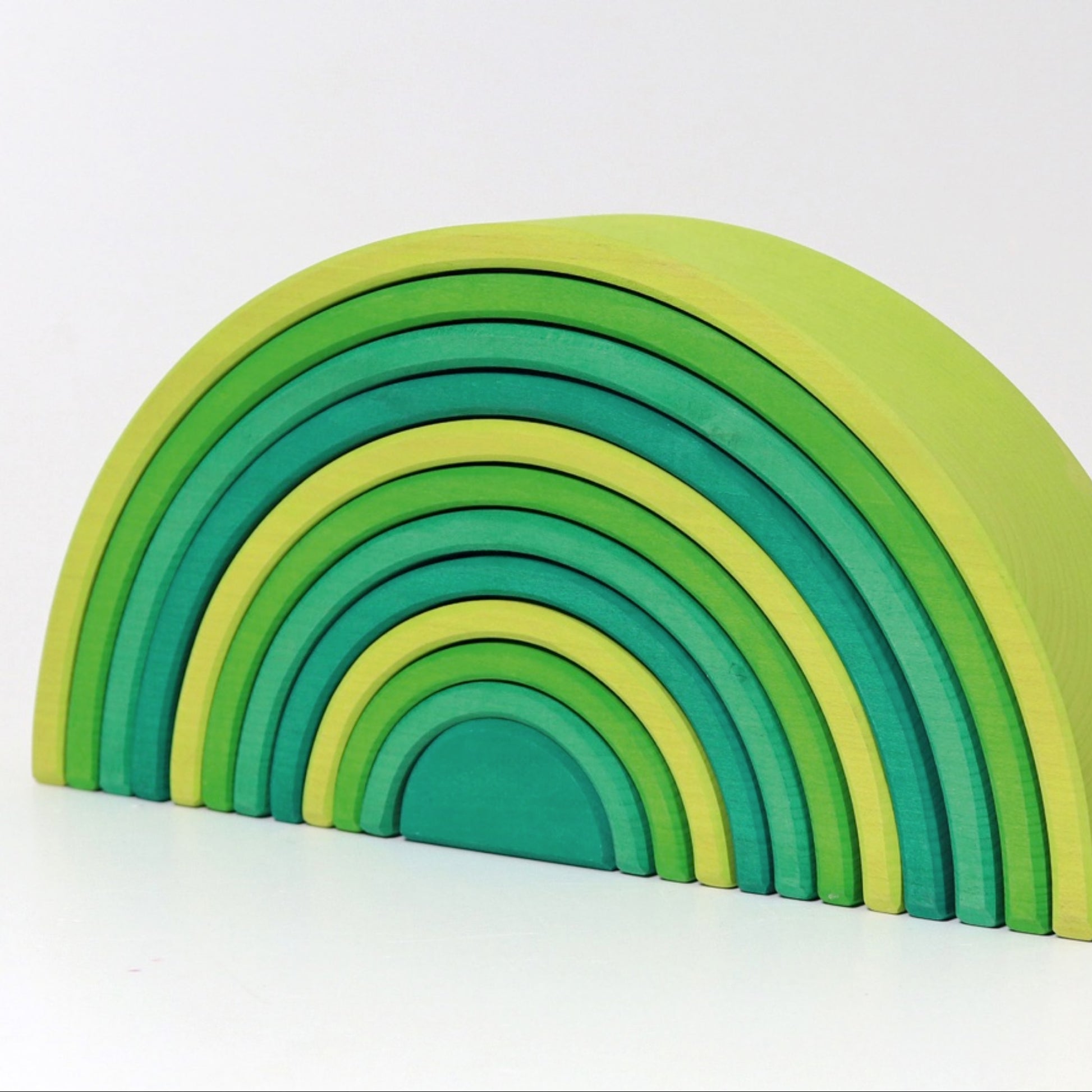 Tolv delar i gröna kulörer, där den största är 38 cm lång och 18 cm hög, perfekta för att stapla, rulla kulor eller bilar igenom, eller använda som bro, tunnel, staket, vagga eller hinder. Tillverkade av FSC-certifierat trä och betsade med giftfria, vattenbaserade färger, erbjuder denna tunnel oändliga möjligheter för kreativ lek. Kompatibel med Grimms figurer och andra produkter. Passar barn från 1 till 10 år, där leken anpassas efter åldern. Miljövänlig och skapad för glädjefyllda stunder.