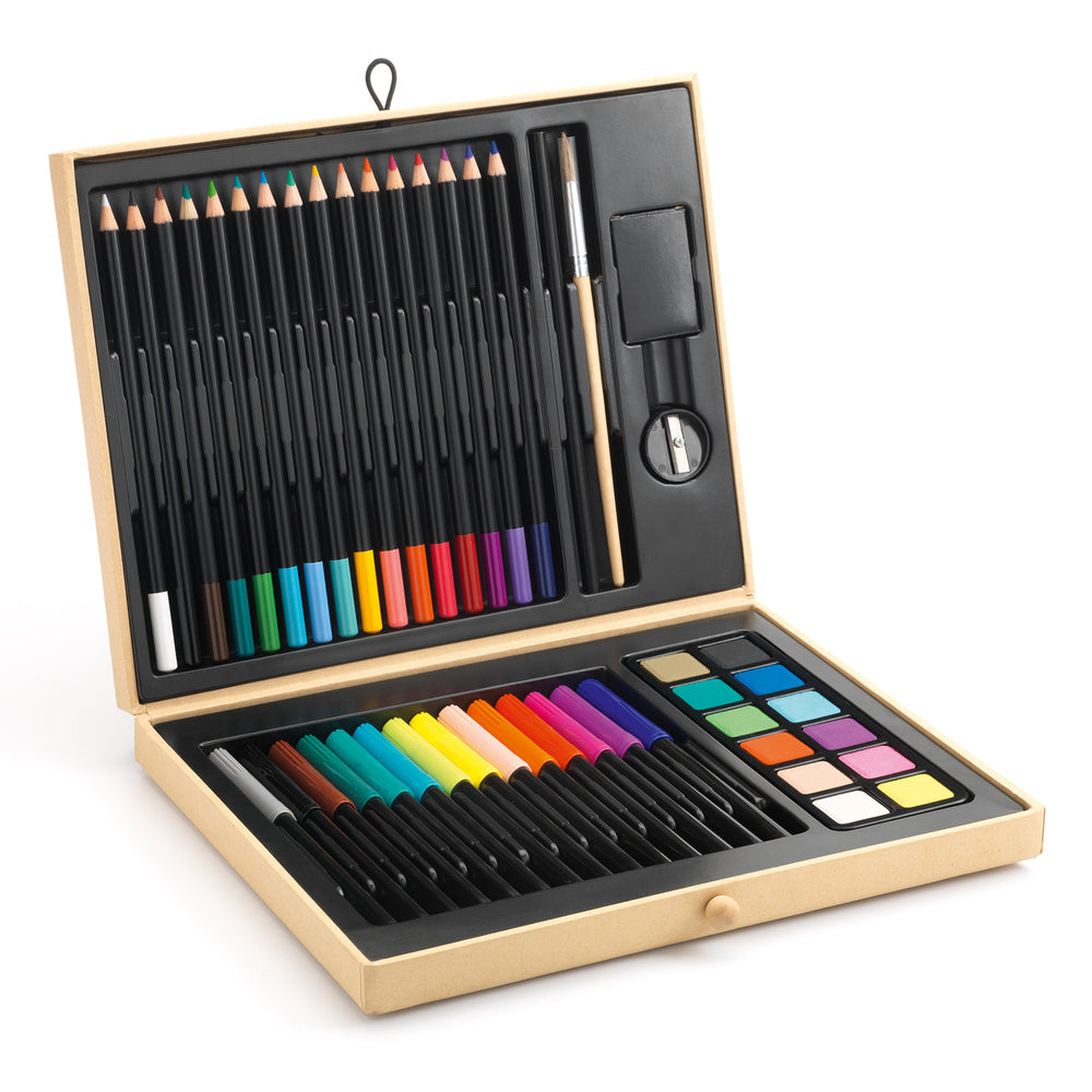 Upptäck den perfekta presenten för små konstnärer från 5 år och uppåt. Denna praktiska och smidiga låda är lätt att ta med sig och fylld med allt som behövs för kreativ lek. Innehåller 16 färgpennor, 14 tuschpennor med smal spets, 1 blyertspenna, 1 pennvässare, 1 suddgummi, en ask med 12 opaka vattenfärger (gouache) och 1 pensel. Lådan mäter 26 x 20 x 4 cm. Säkerhet och hållbarhet står i fokus – produkten är certifierad och tillverkad av hållbart producerat material, vilket ger trygghet för både barn och föräldrar. Lådans trä är dessutom täckt med kraftigt papper, så barnen kan sätta en personlig touch genom att färglägga den själva. Med högkvalitativa material och en mängd verktyg stimuleras kreativiteten och leklusten, vilket gör Color Box till en favorit för långvarig glädje. Ge barnen en värld av färg och fantasi – perfekt för både hemma och på språng.