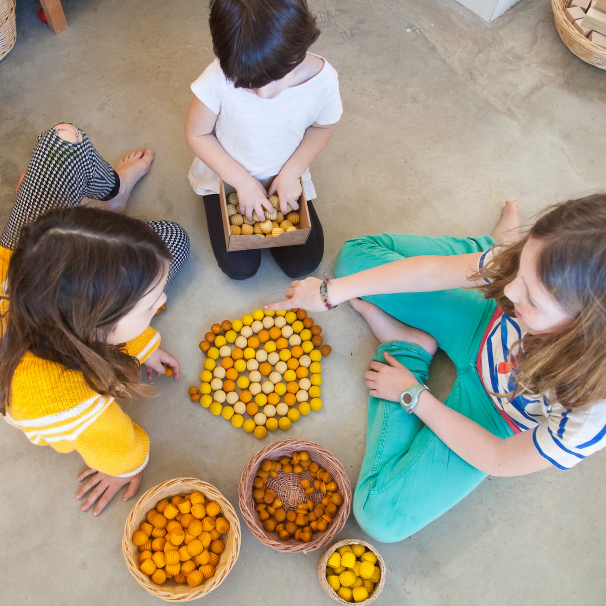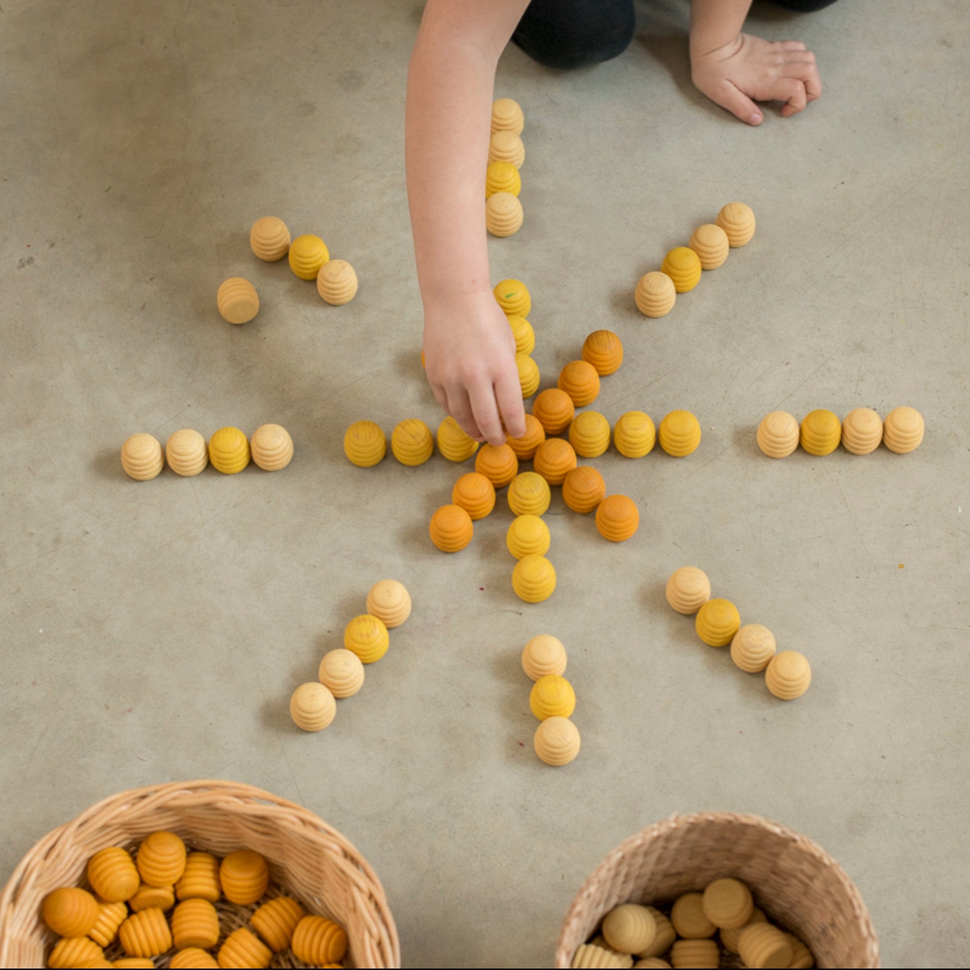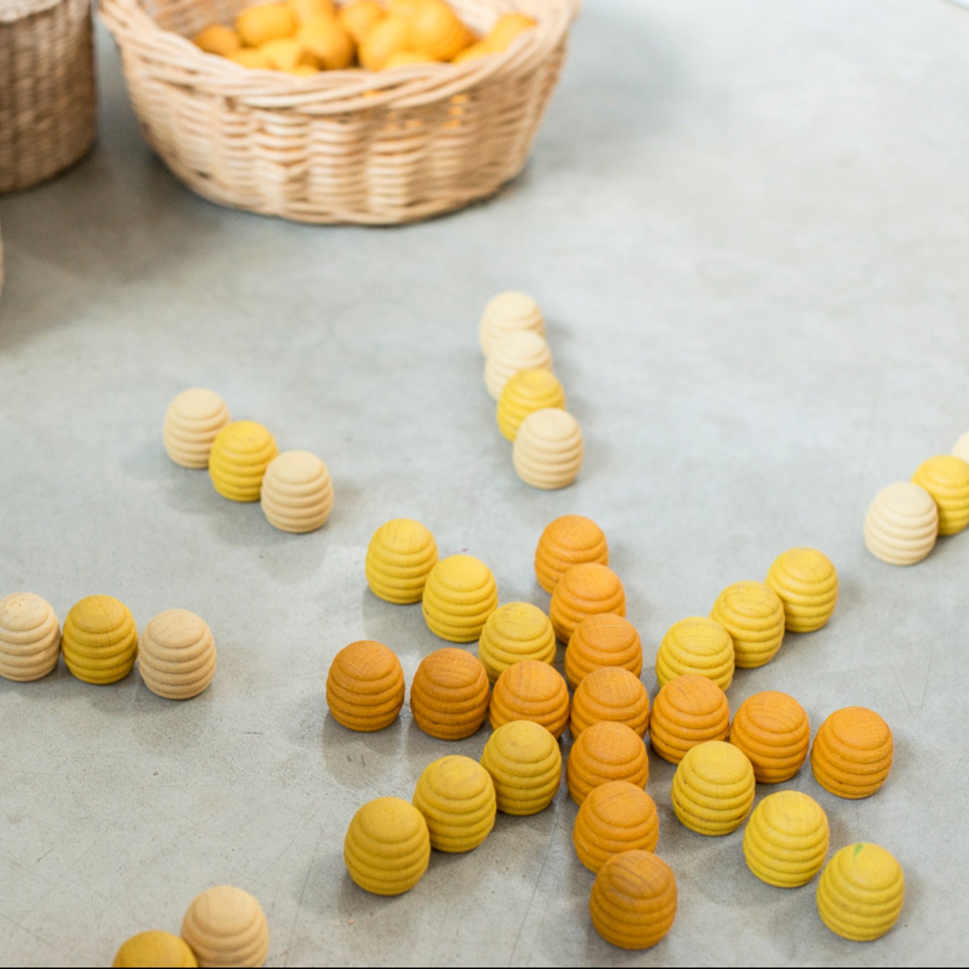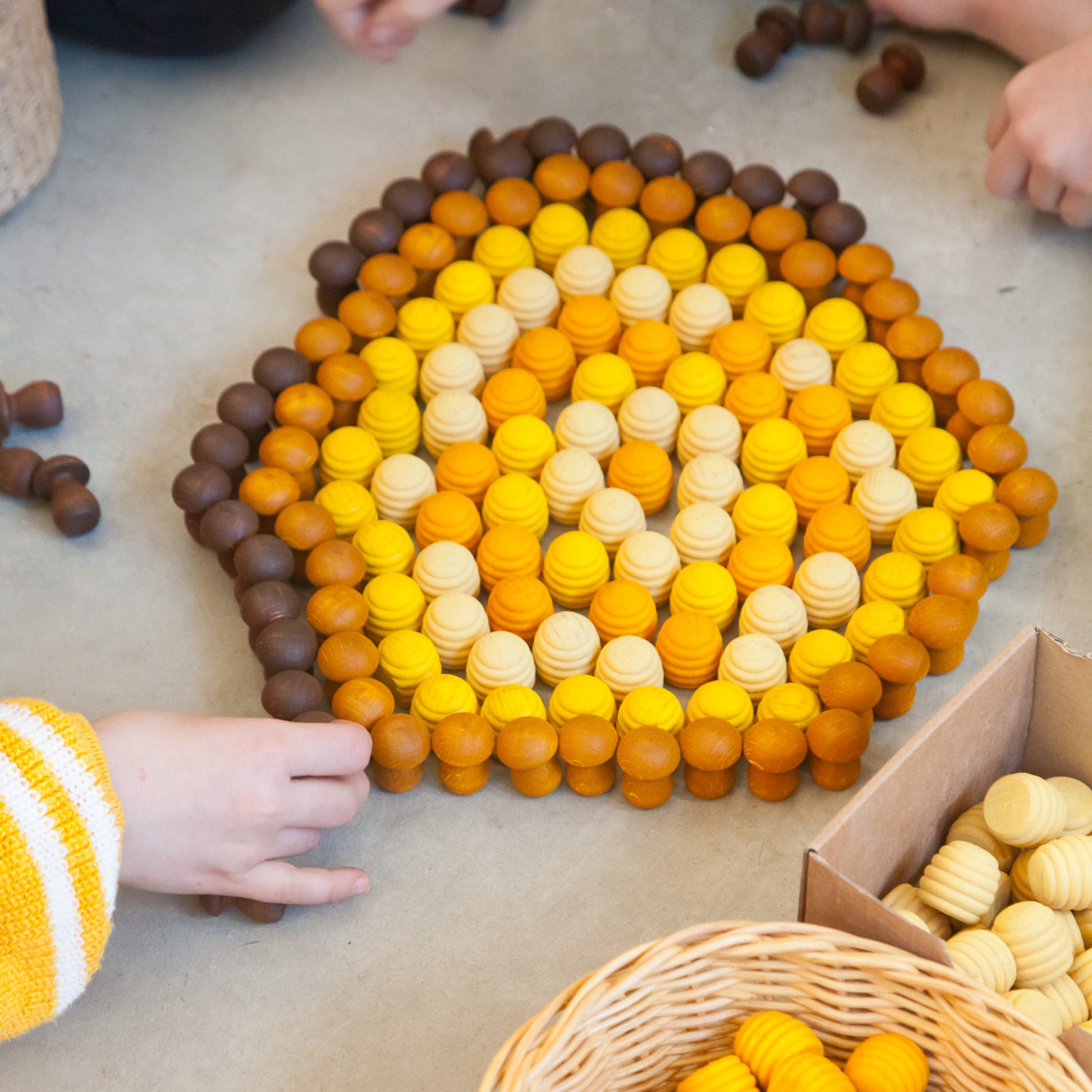 Trettiosex handgjorda bikupebitar i olika gula nyanser, 4,5 cm höga, perfekta för fri lek och skapande av mönster. Tillverkade av hållbart trä med vacker, naturlig ådring som känns levande och doftar gott, främjar dessa bitar logiskt-matematiskt tänkande genom klassificering, gruppering och association. Levereras med en praktisk förvaringspåse. Passar barn från 3 till 10 år, där leken anpassas efter åldern. Miljövänlig och skapad för glädjefyllda stunder.