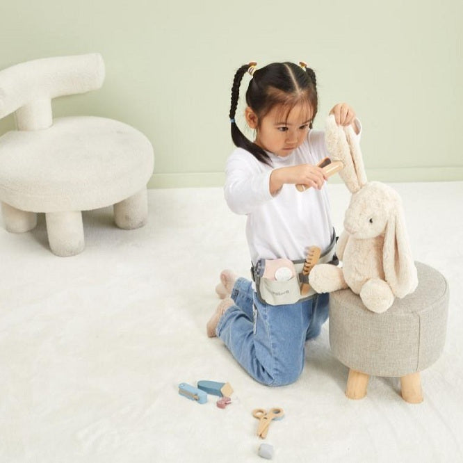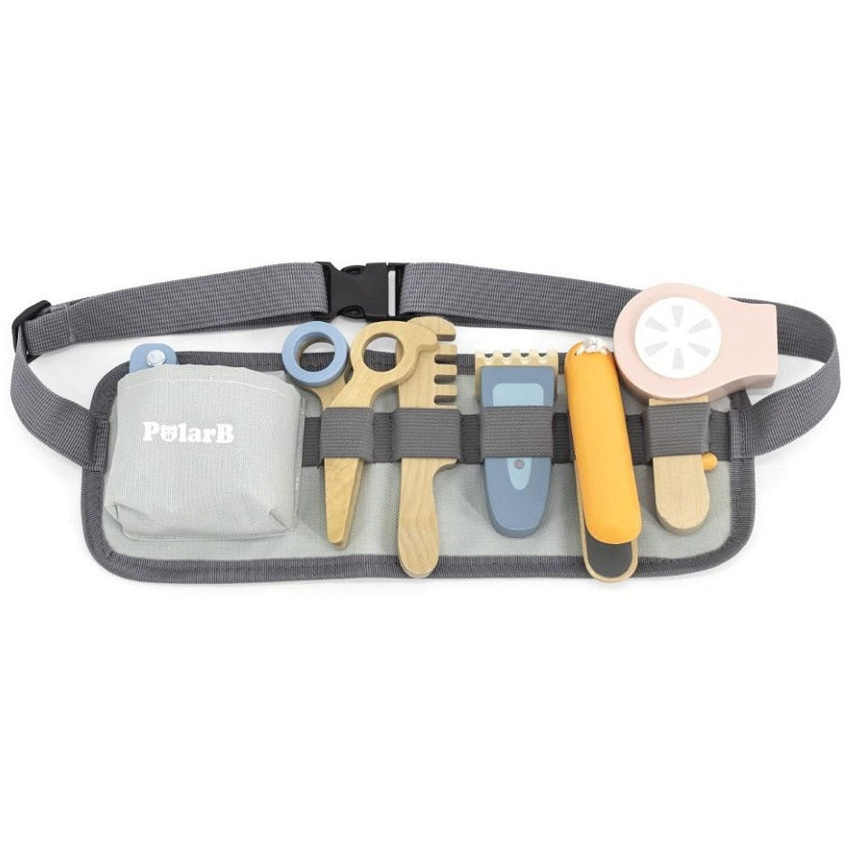 Ett hårfrisörset med åtta delar, inklusive hårtork, kam, sax, två hårsnoddar, rakapparat och rakhyvel, förpackat i en praktisk midjeväska i bomull för enkel användning. Perfekt för barn som älskar fantasifullt rollspel och vill öppna sin egen frisörsalong hemma. Passar barn från 3 år och uppåt för engagerande och miljövänliga lekstunder.