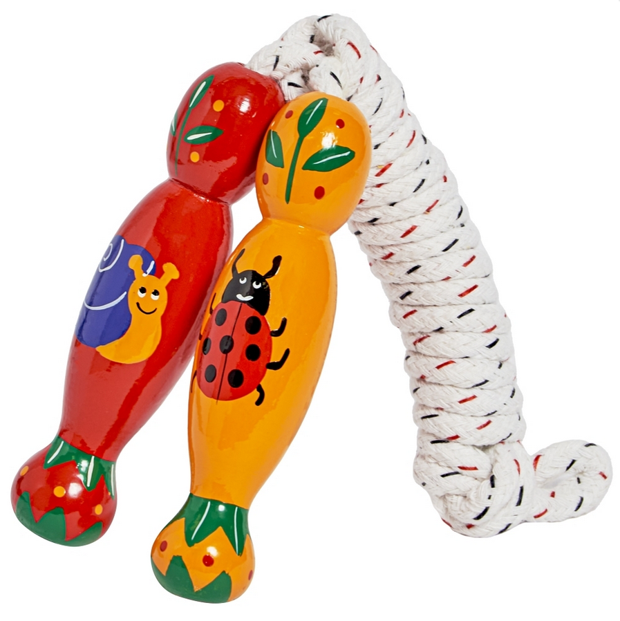 Ett fint hopprep med handtag målade med härliga småkryp. Handtagen är 13 dm långa och själva repet 225 cm långt.