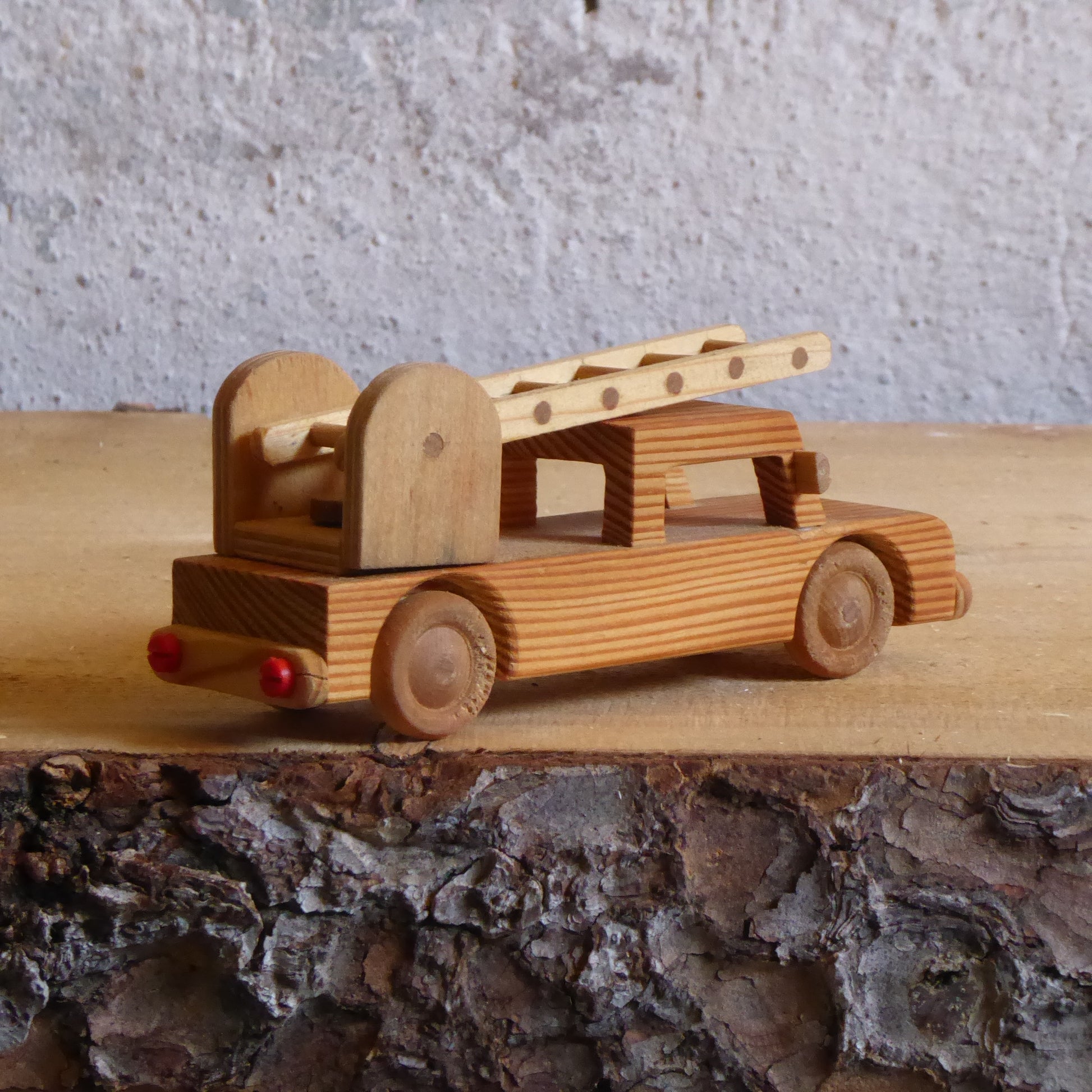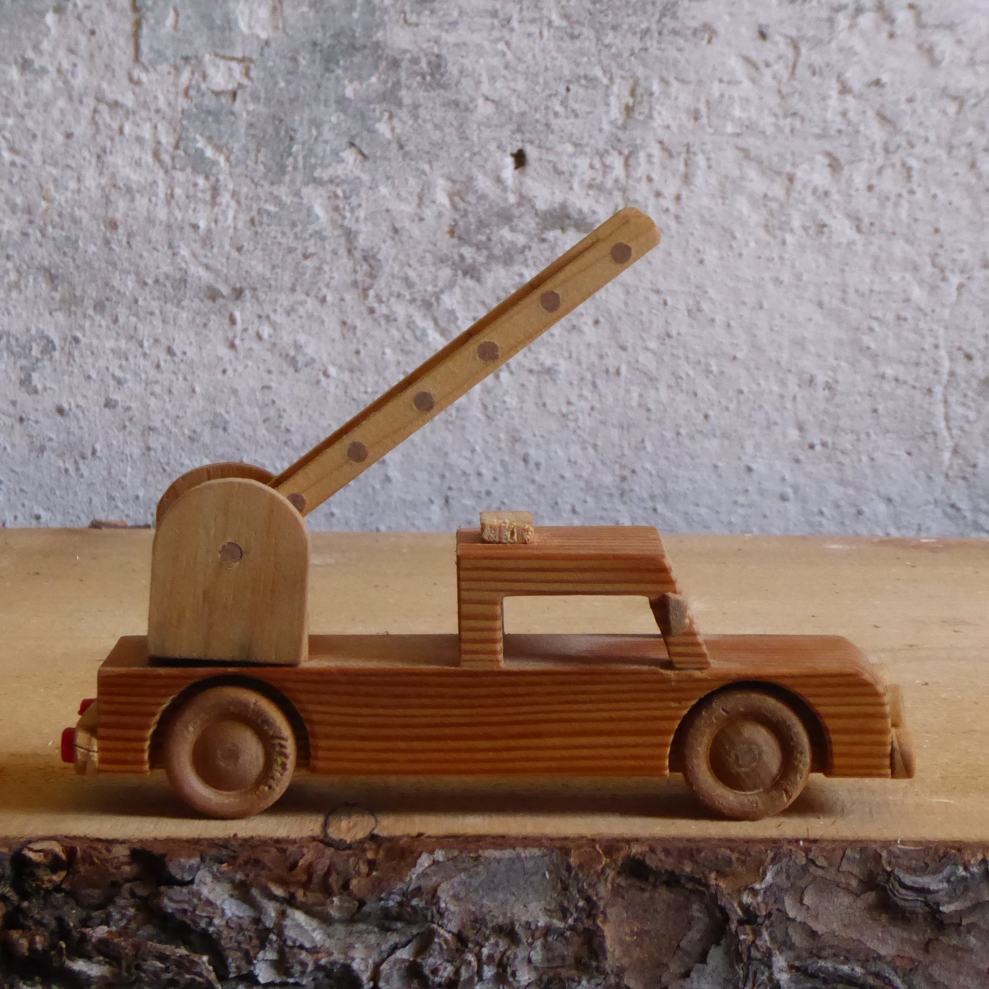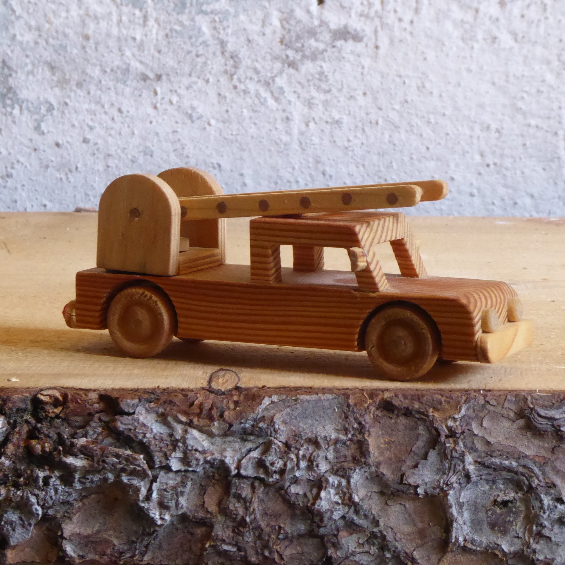En helt handgjord liten brandbil med vridbar och höj- sänkbar stege. Den ingår i vår serie "hjälteprodukter" då den är tillverkad av en svensk hobbyist. Den är tillverkad av spillvirke och monterad med hjälp av trälim och pluggar och fått en finish av naturligt vax. Oerhört charmig och passar lika bra som prydnad som leksak. Mäter ca 16 cm.