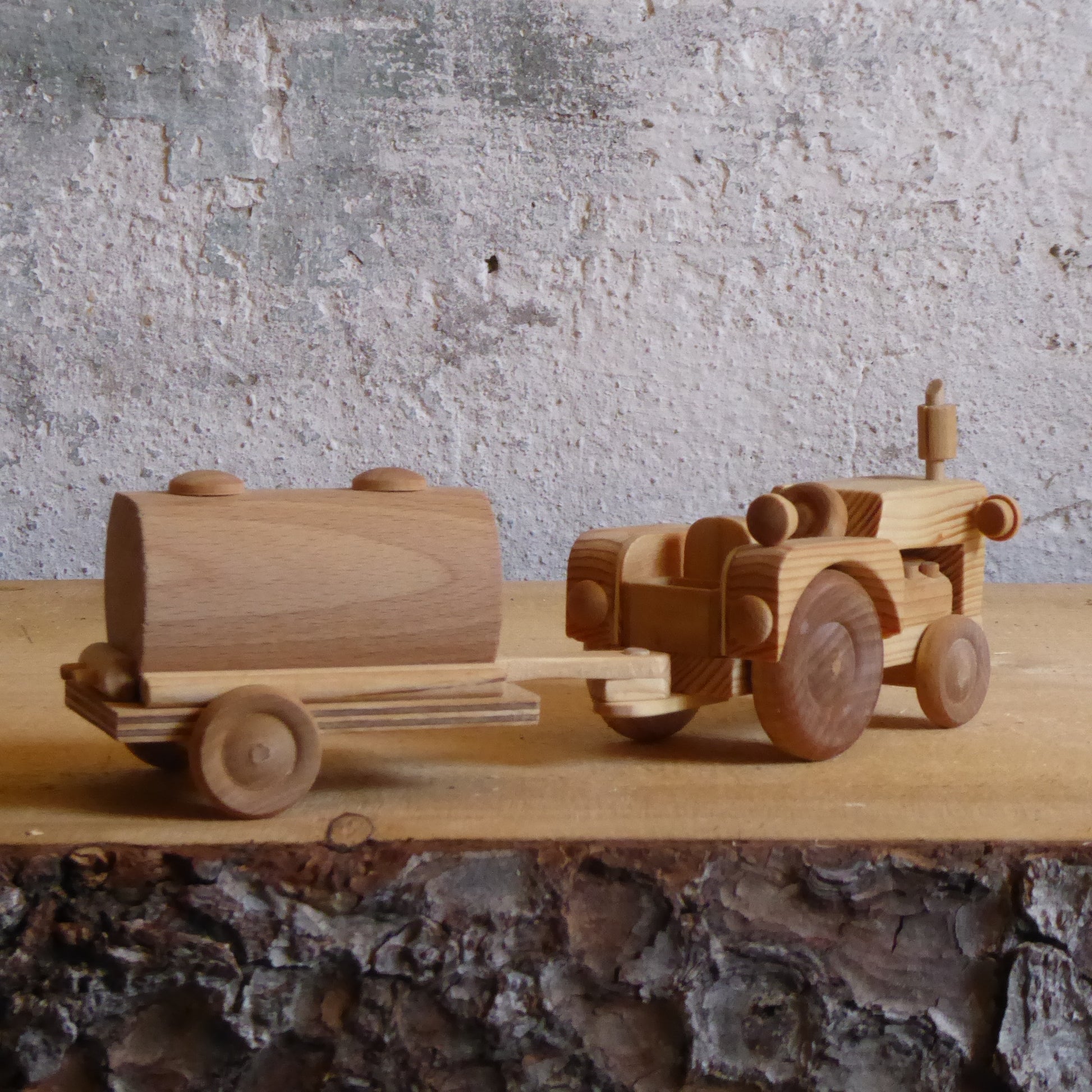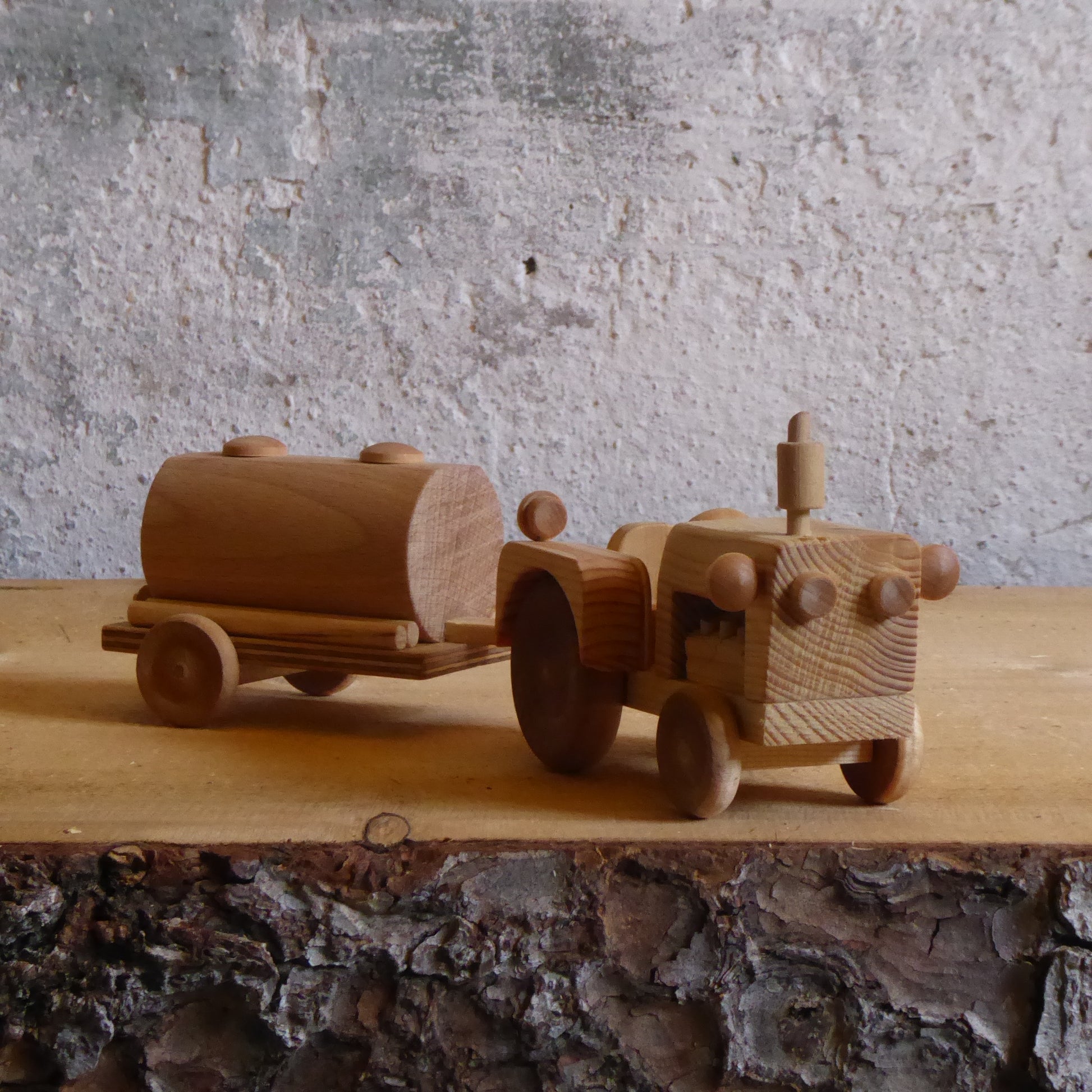 Den här lilla traktorn med avtagbart släp är helt handgjord av spillvirke. Den ingår i vår serie "hjälteprodukter" då den är tillverkad av en svensk hobbyist. Den är monterad med hjälp av trälim och pluggar och fått en finish av naturligt vax. Oerhört charmig och passar lika bra som prydnad som leksak. Ekipaget mäter ca 28 cm.