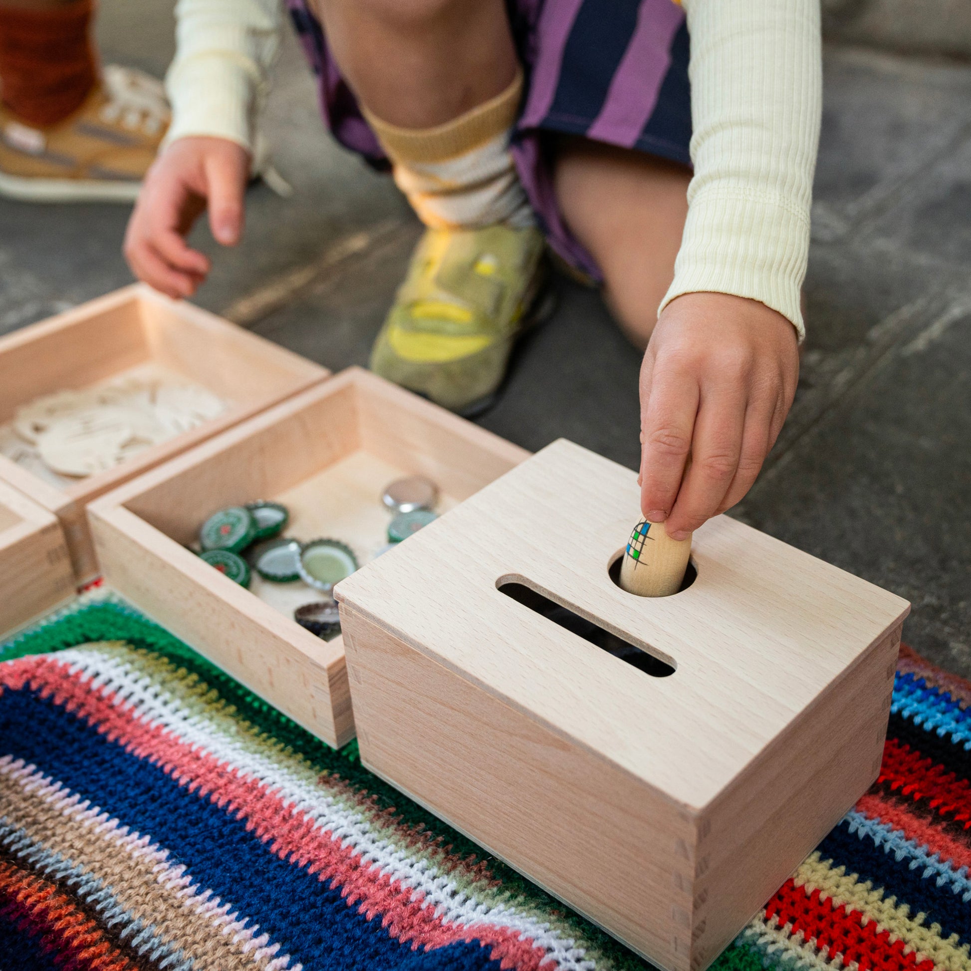En åda för lek och förvaring. Nu syns den, nu är den borta, men alltid redo för nya äventyr. Denna charmiga låda är perfekt för att lära sig om objektpermanens, gömma småsaker eller väcka fantasin. Tillverkad av hållbart trä i Katalonien av ett litet familjeföretag som värnar om naturen och barns kreativa lek. Hög kvalitet, miljövänlig och skapad för stunder fyllda av glädje.